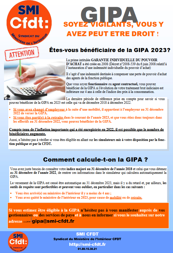 Pour connaitre votre Gipa 2023, utilisez le simulateur de la CFDT à télécharger. Il vous suffit d’indiquer vos indices figurant sur vos fiches de paie de décembre 2018 et 2022.
