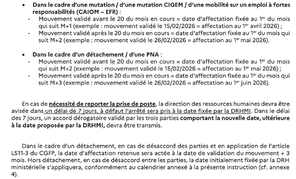 | Période de gel des affectations en raison des élections professionnelles : du 2 octobre au 10 décembre 2026 inclus. Les cases grisées correspondent aux dates d’affectation modifiées en application de cette période de gel. | ||||